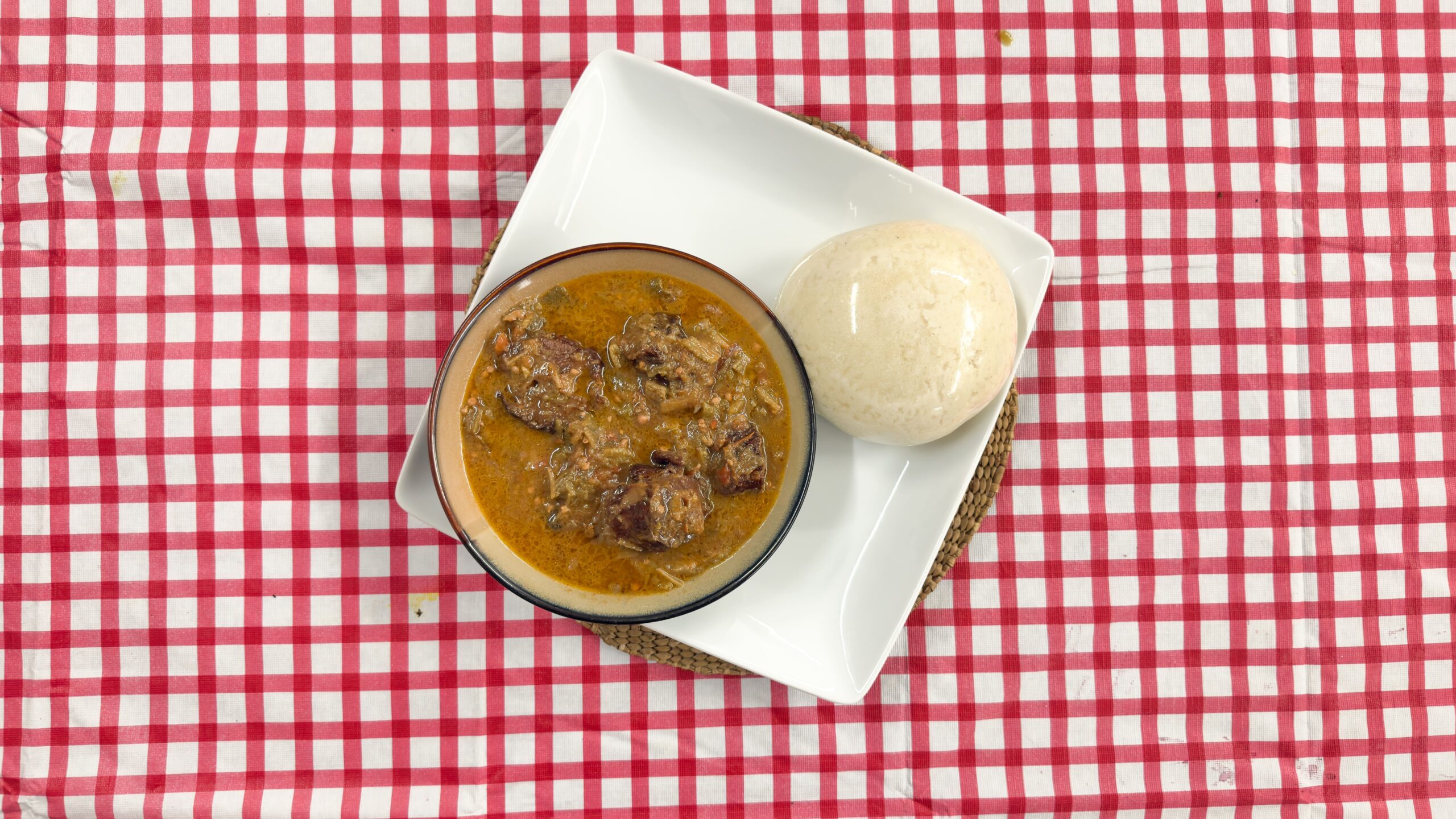 Okra cooked down in a rich tomato-based stew, served with rice. (1 plate)